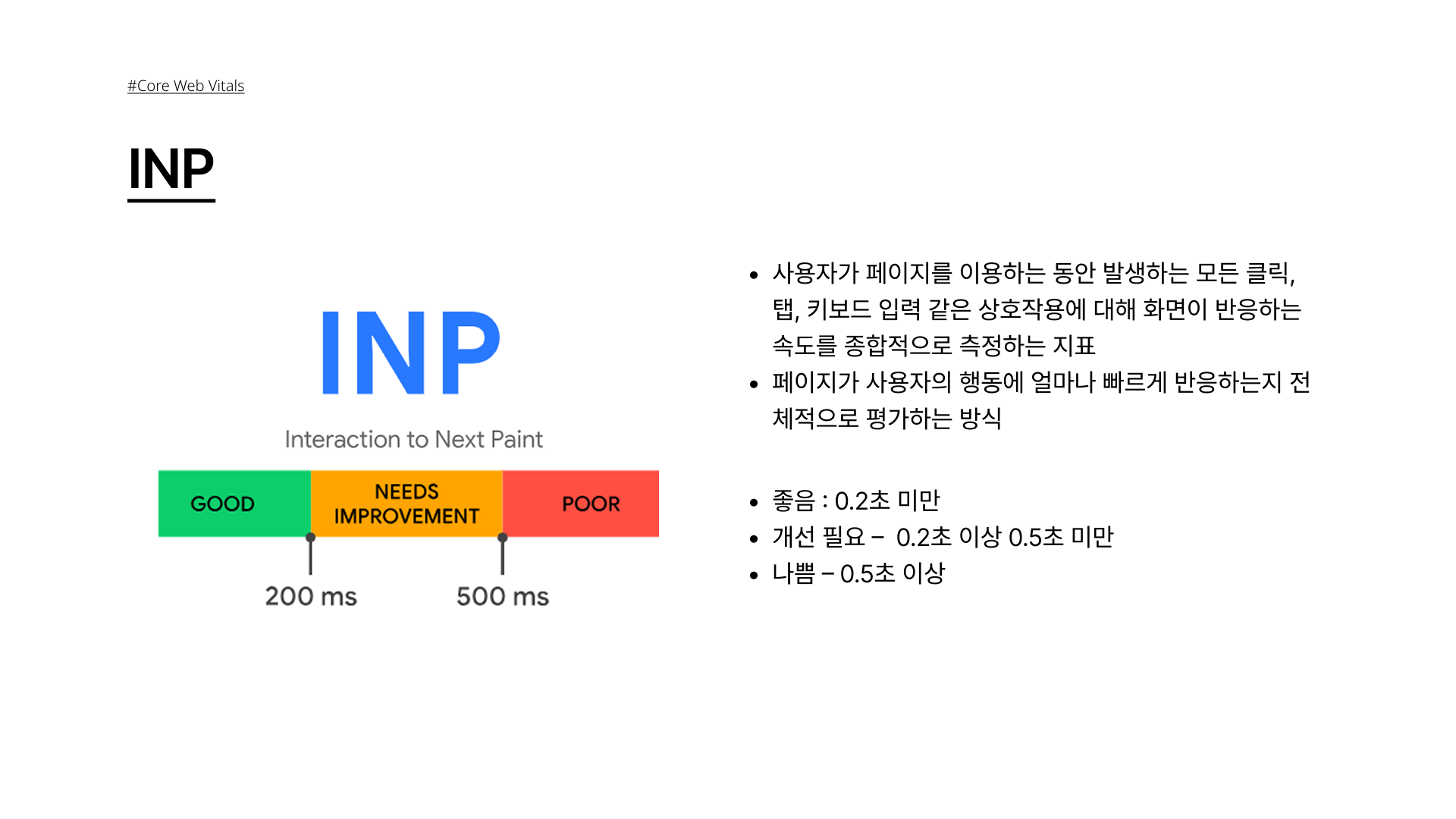 즉, INP는 FID보다 더 실제 사용자 경험에 가까운 지표 입니다.